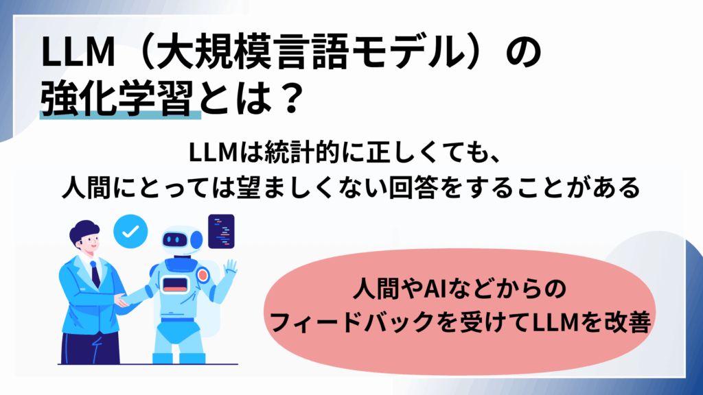 そのような要因となるのが、AIの不自然な回答によるものでしょう。それは言い回しであったり、人間の求めるタスクに応えられていなかったりすることが原因と考えられます。このような状況を改善するためにはLLMの強化学習が必要となります。