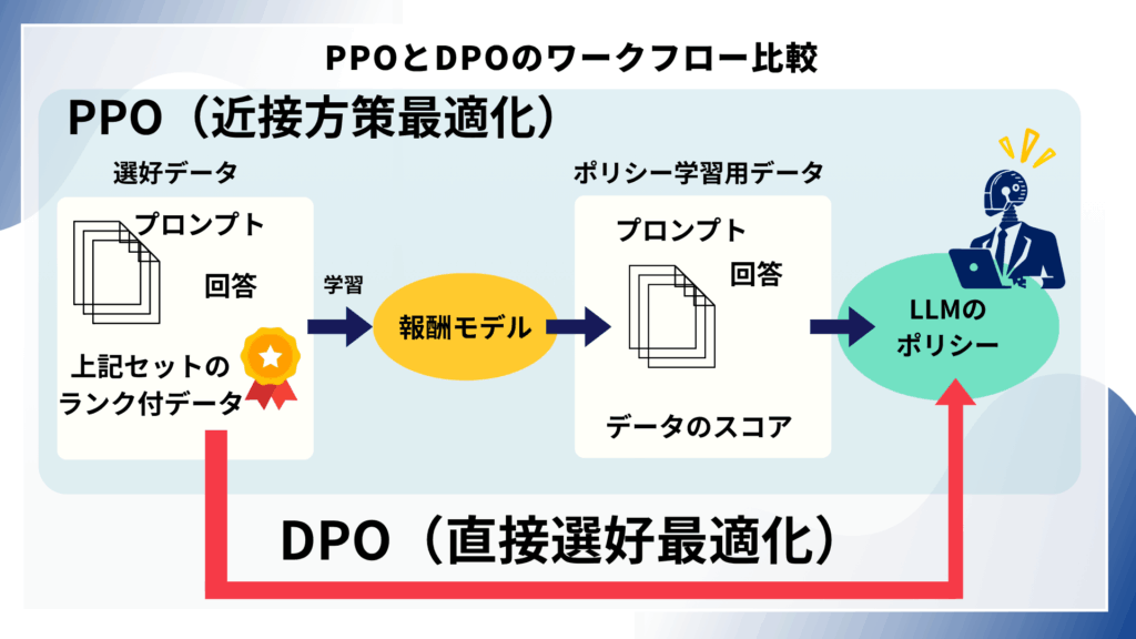 上記のPPOを用いたRLHFによる強化学習は報酬モデルを学習させた上で、それによるLLMの学習を行うため、手間がかかってしまう、という見方ができます。