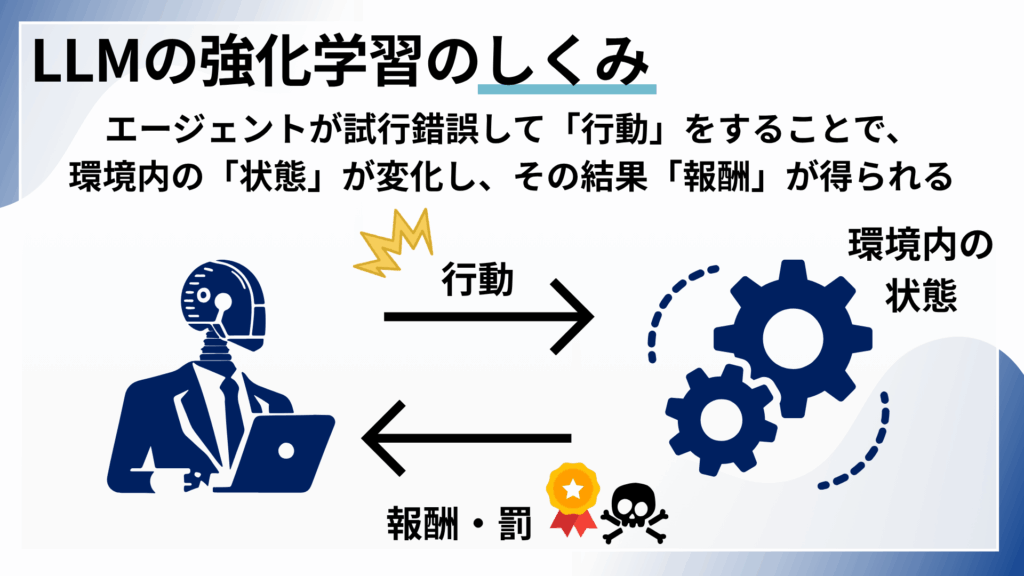 学習においては、LLMが「エージェント」という役割を担い、ある環境の中で最良の結果を得られるように学んでいきます。そして、エージェントはポリシー(方策)を定め、それをもとに行動していきます。