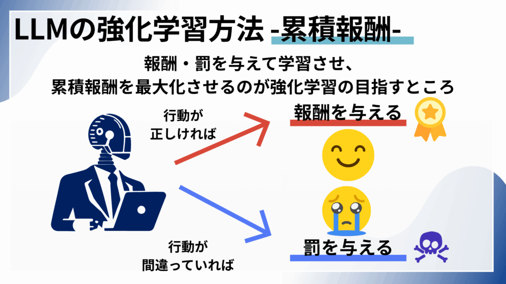 このように、LLMの強化学習は、LLMが目に見えない環境で最適な結果を達成できるようにする手法といえます。