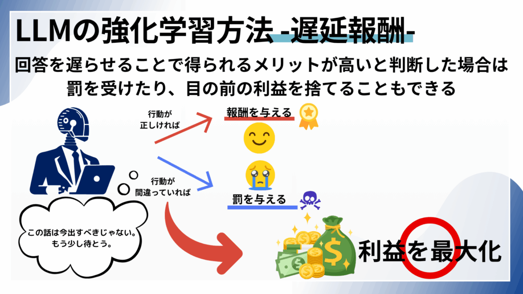 さらに、強化学習の特筆すべき点は、「遅延報酬(Delayed Gratification)」、つまり、回答を先延ばしにすることで得られるメリットが高いと判断した場合に目の前の利益を「犠牲」したり、「罰」を受けたり後戻り対応ができる能力も持ち合わせているということです。