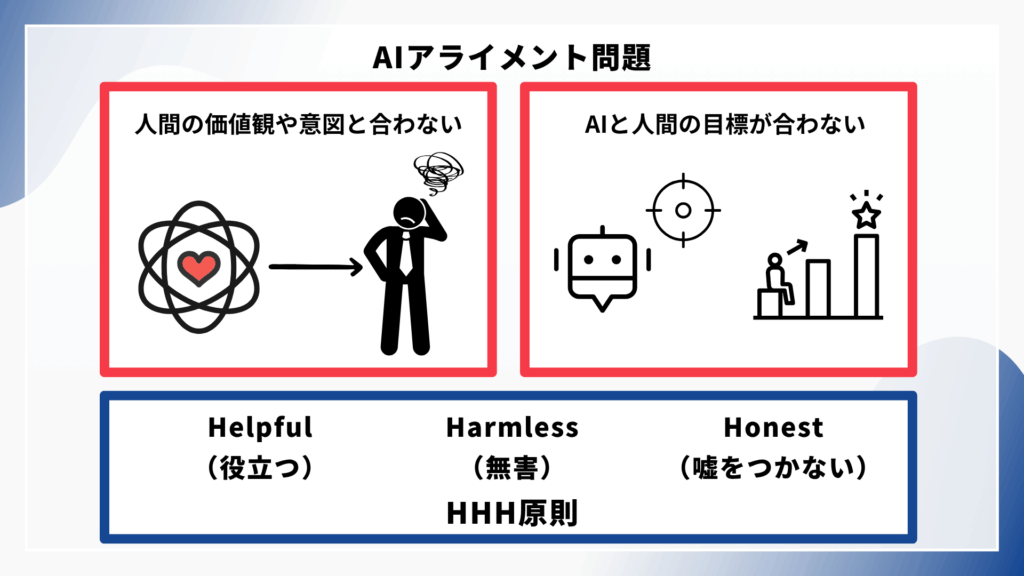 アライメント問題とは、LLMの行動が人間の意図や目的、価値観、嗜好と整合しない問題を指します。