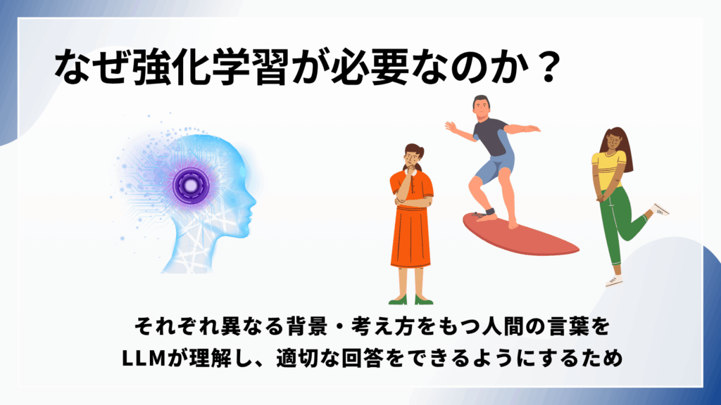LLMにとっての強化学習は、多くの人が生成AIを利用していて感じているような「思ったのと違う」というようなLLMの言動を改善するためにあります。