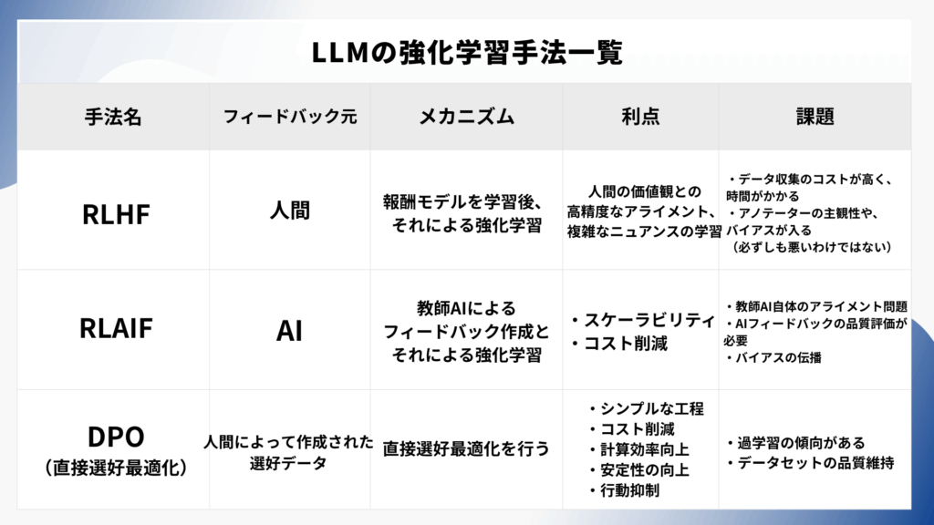 LLMの強化学習は今後もさまざまな手法が出てくると思いますが、現時点でどのような手法があるのかを把握することが開発の成功への近道です。