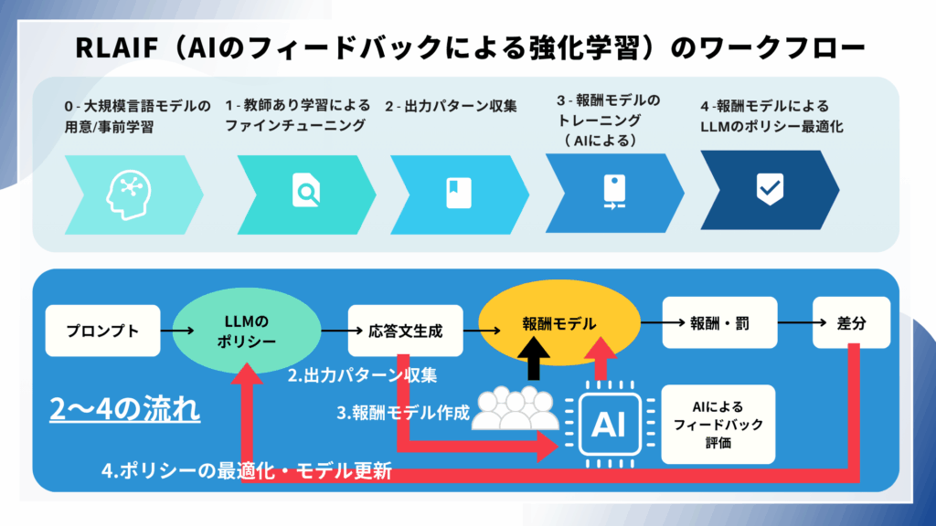 先述したように、人間によるフィードバックは最近ではAIに置き換えて行うことができるようになりました。AIフィードバックによる強化学習(Reinforcement Learning from AI Feedback, RLAIF)は、強化学習のプロセスにおいて、LLMが他のLLMにフィードバックを提供する機械学習技術であり、人間によるフィードバックに置き換わる強化学習の手法です。