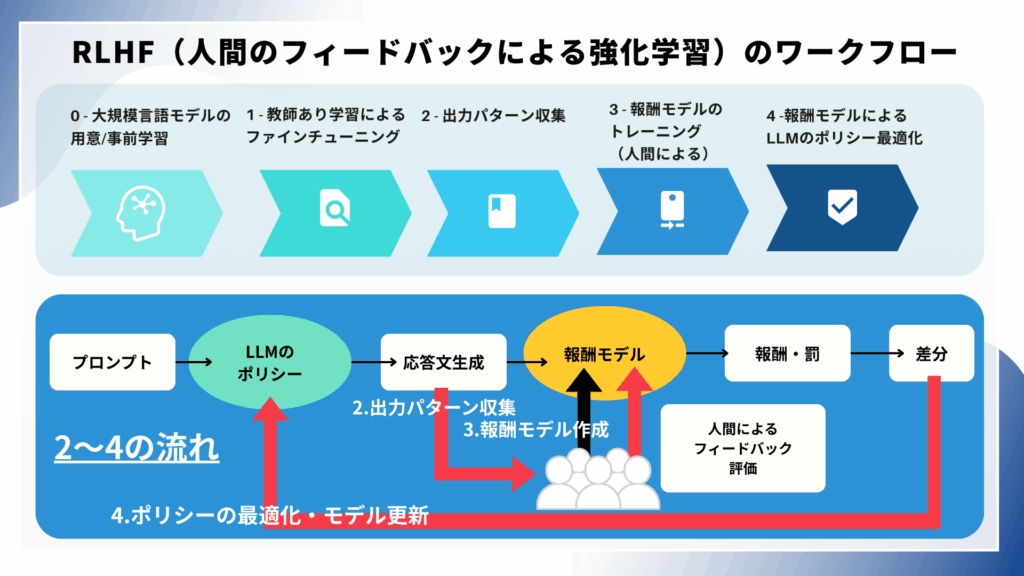 RLHF(Reinforcement Learning from Human Feedback:人間によるフィードバックからの強化学習)は、人間のフィードバックを活用して機械学習モデルを最適化し、より効率的な自己学習を可能にする強化学習の手法です。この手法では、強化学習の報酬関数に人間の入力が組み込まれます。