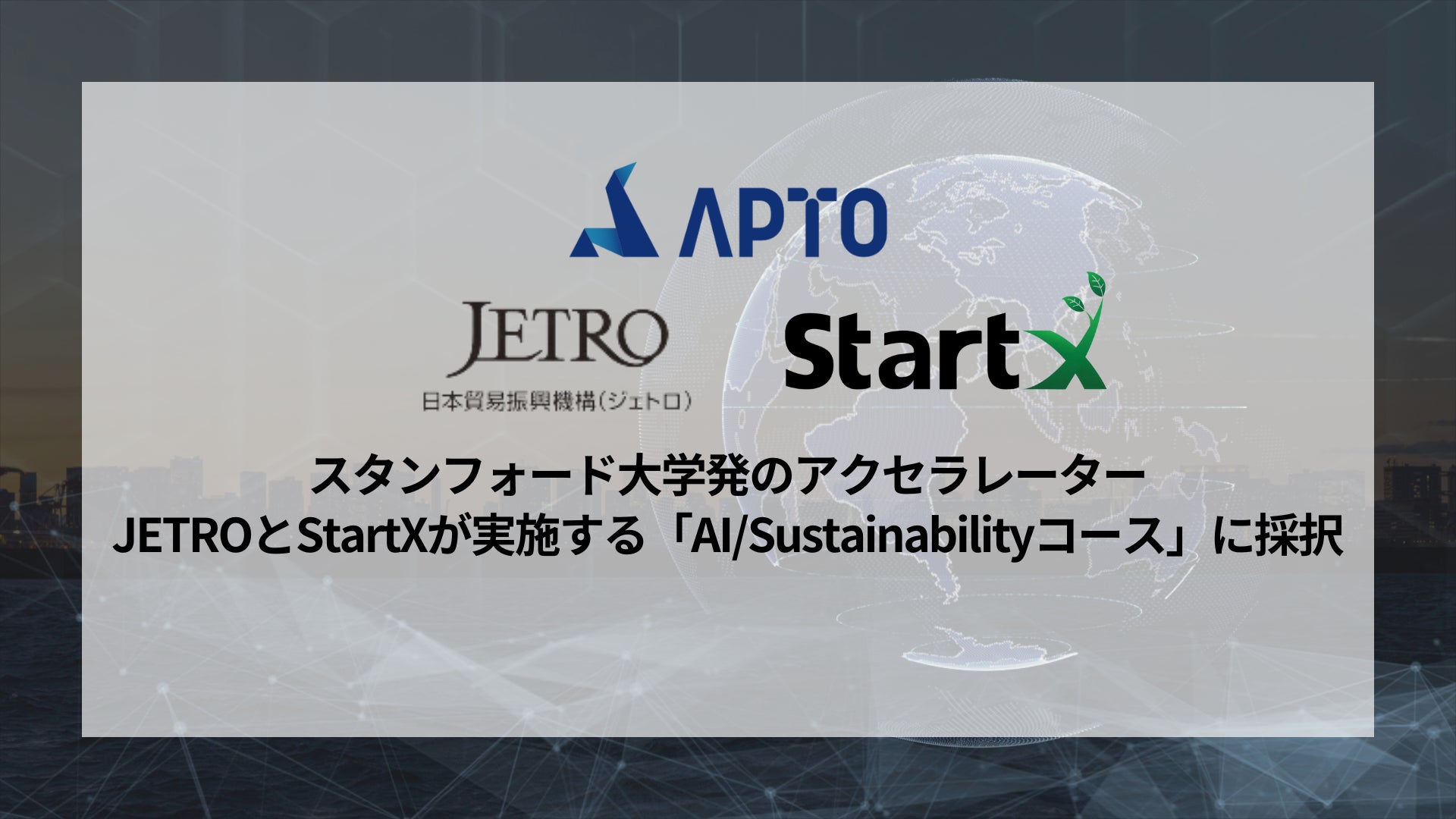 株式会社APTO(本社:東京都港区、代表取締役CEO:高品良、以下「APTO」)は、JETRO(独立行政法人日本貿易振興機構)が内閣府および経済産業省の協力のもと実施する、国内スタートアップ企業の海外進出を支援するプログラム「グローバル・スタートアップ・アクセラレーションプログラム(GSAP:Global Startup Acceleration Program)」において、スタンフォード大学発のアクセラレーターであるStartXと連携した「AI/Sustainabilityコース」に採択されたことをお知らせいたします。