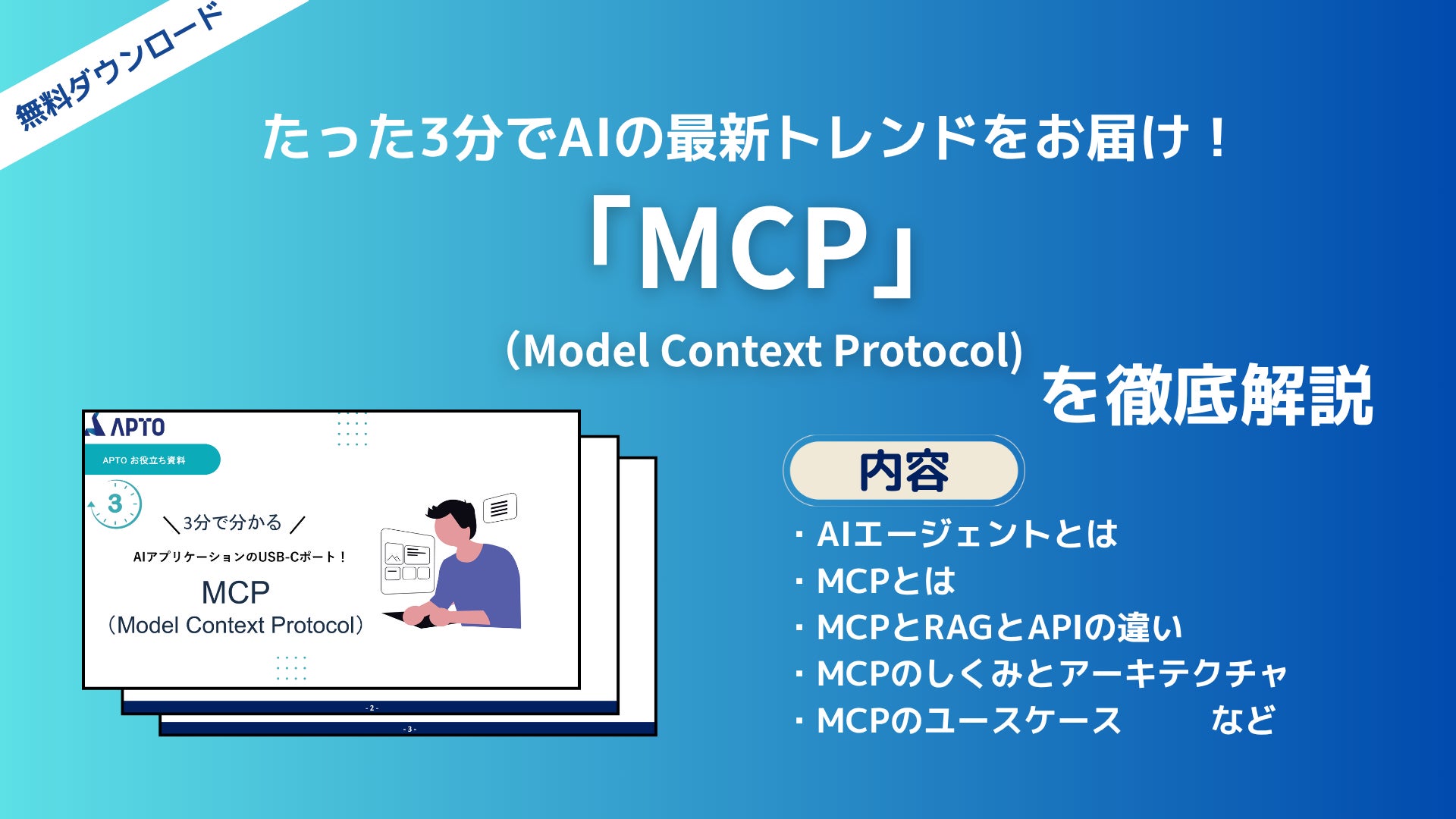 APTOは、AIモデルと外部システムをつなぐ新しい標準規格「MCP(モデルコンテキストプロトコル)」に関する資料を無料で公開いたしました。