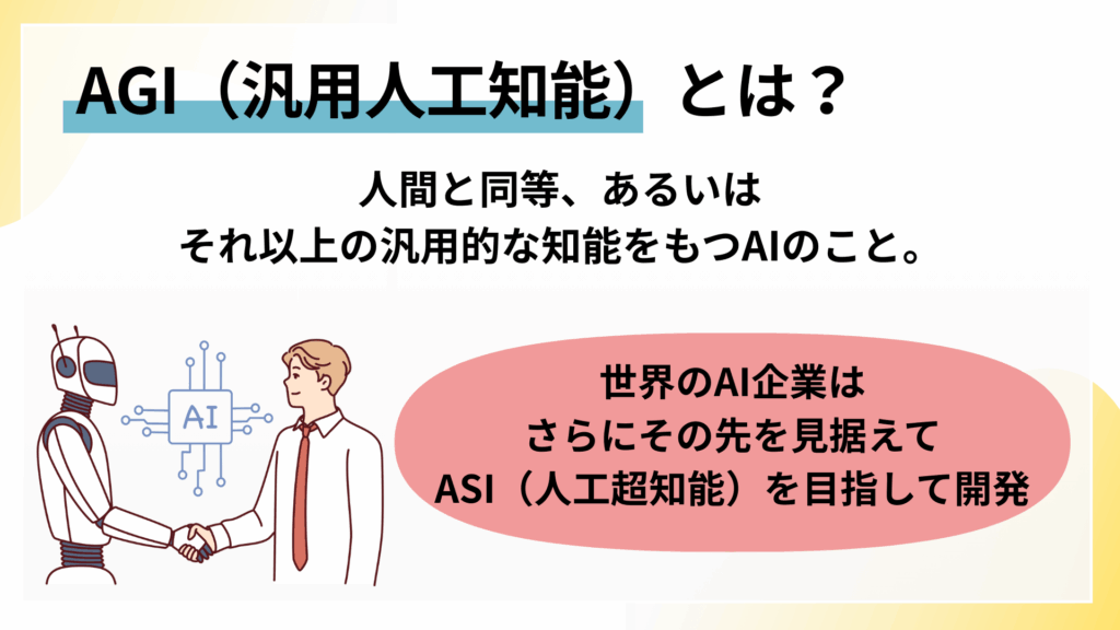 これまでのAIは私たちが実際に使用しているような特定のタスクをこなすことに特化したものでしたが、AGIはその名の通り、汎用的なAI、つまり、人間ができるようなことや人間以上にできることが多いAIとして開発が進められています。