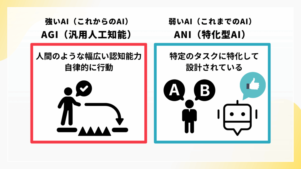 何でもできる「強いAI」であるAGIは、人間のように幅広い認知能力を備え、自律的に行動することを目標とするAIを指します。これは、特定のタスクに特化して設計されたこれまでのAI(弱いAI)とは根本的に異なるものです。この弱いAI、つまり現行で使われているこれまでのAIは、AGIが出てきたことで、一部のタスクをこなすことができる「特化型AI(ANI:Artificial Narrow Intelligence)」と呼ばれることもあります。
