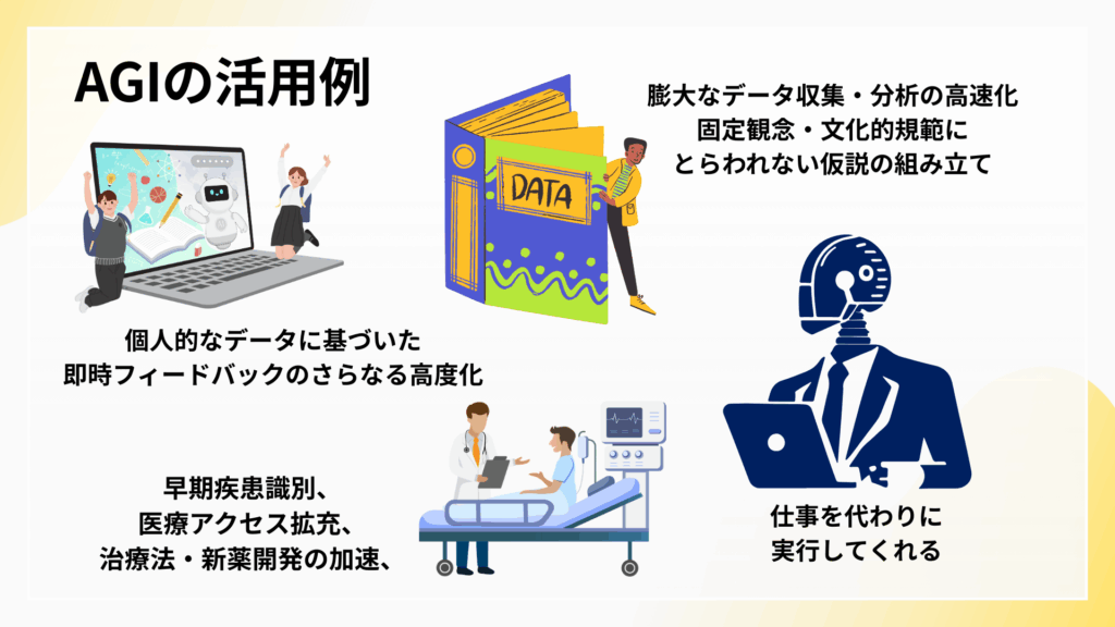 特に、AGIは早期疾患識別や予後予測の精度を向上させ、治療の質を改善することができ、医療アクセスの拡充、時間のかかる治療法や薬の開発に貢献しうるとされています。