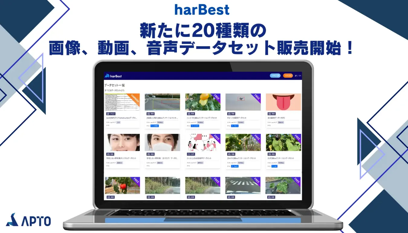 株式会社APTO(代表取締役: 高品 良)は、同社が提供するAI開発向けのデータプラットフォーム「harBest」に、新たに20種類の画像、動画、音声データセットを追加し、提供を開始しました。