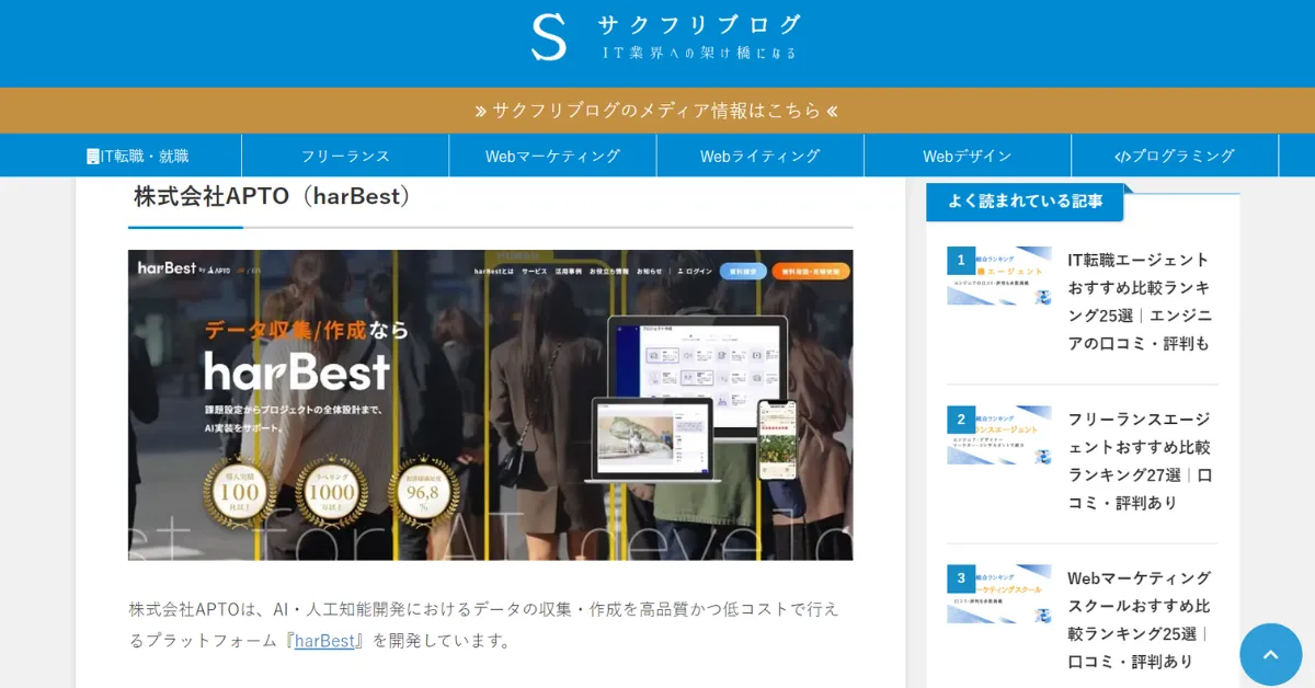 【掲載情報】AI用データ収集、データ作成を素早く、低コスト、高品質に実施可能なharBestを提供する株式会社APTO (本社:東京都渋谷区、代表取締役CEO:高品 良) が、デジタルマーケティング支援に特化したWebコンサルティング会社であるサクフリ株式会社が運営しているオウンドメディア『サクフリブログ』に掲載されました。