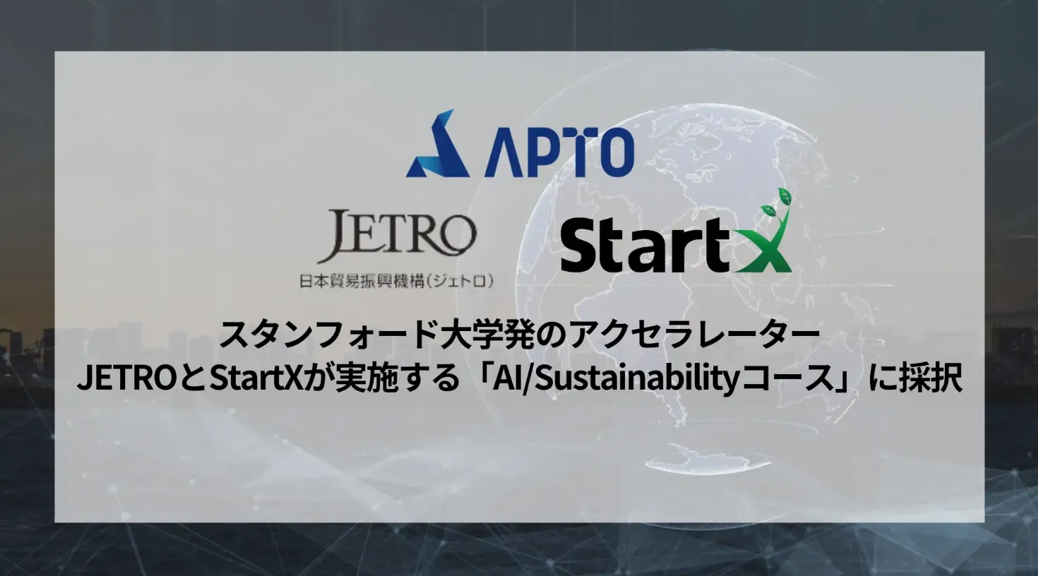株式会社APTO(本社:東京都港区、代表取締役CEO:高品良、以下「APTO」)は、JETRO(独立行政法人日本貿易振興機構)が内閣府および経済産業省の協力のもと実施する、国内スタートアップ企業の海外進出を支援するプログラム「グローバル・スタートアップ・アクセラレーションプログラム(GSAP:Global Startup Acceleration Program)」において、スタンフォード大学発のアクセラレーターであるStartXと連携した「AI/Sustainabilityコース」に採択されたことをお知らせいたします。