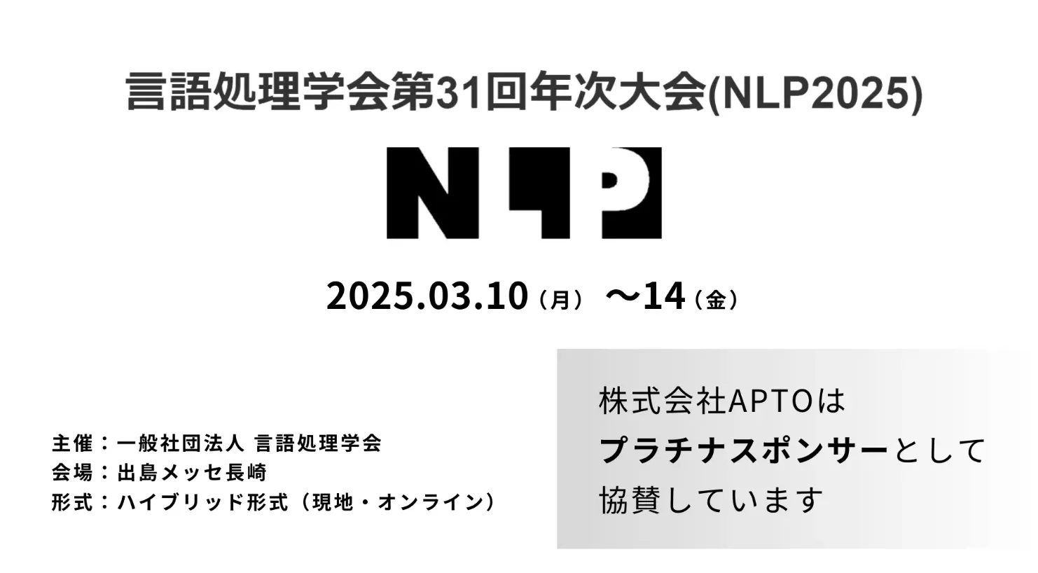 3月10日(月)〜14日(金)「言語処理学会第31回年次大会(NLP2025)」において、プラチナスポンサーとして協賛することをお知らせします。