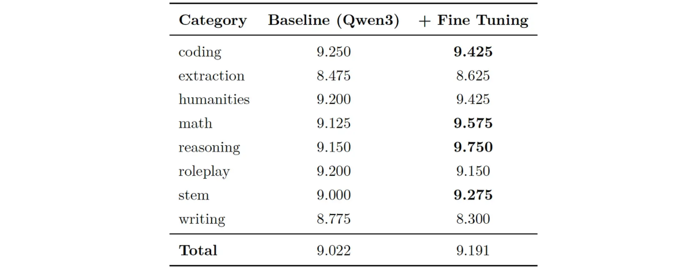 Baseline (Qwen3) は、通常の Qwen3 に対して reasoning を行うオプションを付与した場合のスコアを、+FineTuning は同梱のデータセット100件に同条件で作成した合成データを加えて Fine Tuning を行ったスコアを示しております。Japanese MT–Bench では Category に示されるような8種類のカテゴリに関する質問が10問用意されており、それに対する回答を OpenAI 社の gpt-4.1モデルのAPIを用いて10点満点で自動評価したスコアの平均を記載しております。23