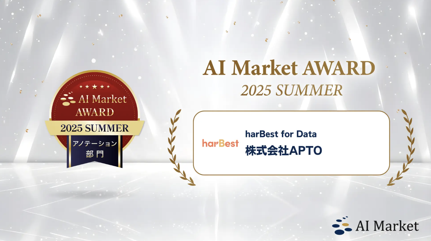 当社の提供するharBest for Dataが、BizTech株式会社が運営するAI活用支援サービス「AI Market」が主催する表彰制度「AI Market AWARD 2025 Summer」において、【アノテーション部門】の受賞企業に選出されました。