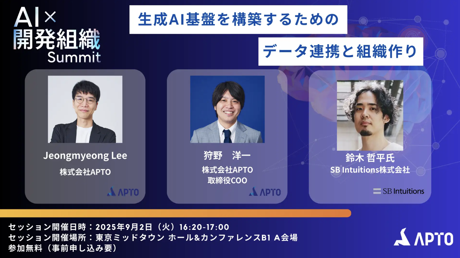 APTOは、2025年9月2日(火)開催の『AI×開発組織Summit2025』にてパートナーセッションに登壇することをお知らせします。